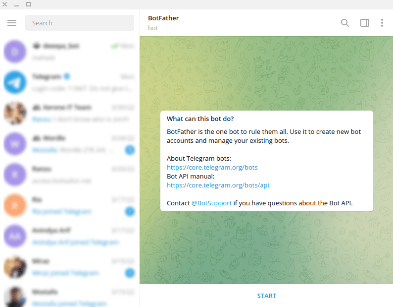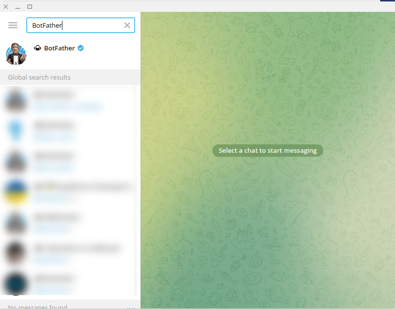 To build a Telegram bot with Botlaris, first, open your Telegram App. Then in the search bar of the app, search with the ‘BotFather’ keyword. Then select the verified BotFather account.