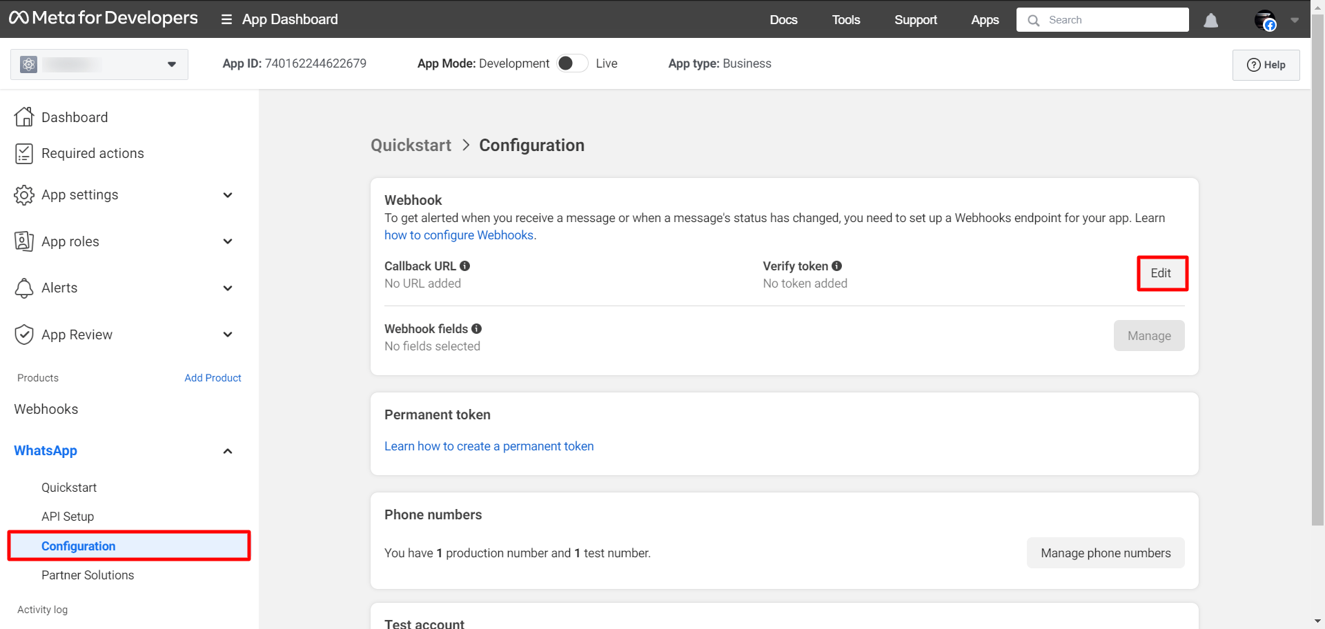 Now, you have to configure the webhook to receive messages. To configure webhooks, go to step 3 from the API setup and click on the Configure webhooks link.