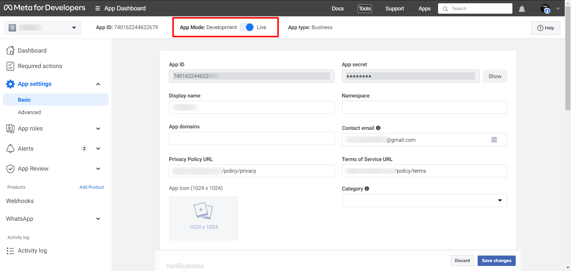 Then from the App settings, click on the Basic option and add the Privacy Policy URL and Terms of Service URL from the Botlaris. These URLs are available on the Connect bot page of Botlaris. After adding these URLs just click on the “Save changes” button.
