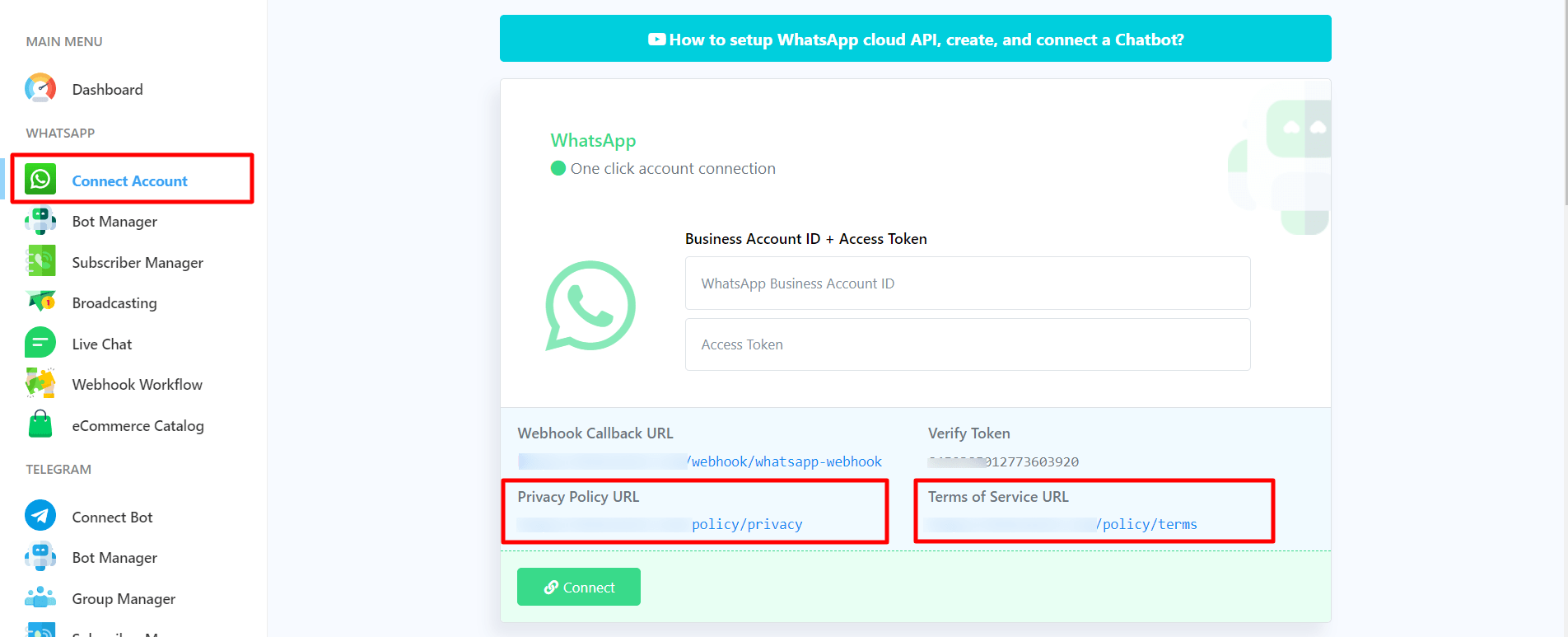 To get the callback URL and verify the token from Botlaris. Login to your account and go to the dashboard of Botlaris. At the left sidebar of the Dashboard, under the WhatsApp section, you will see connect WhatsApp option. Now click on the connect WhatsApp menu and instantly, Connect WhatsApp Business page will appear.